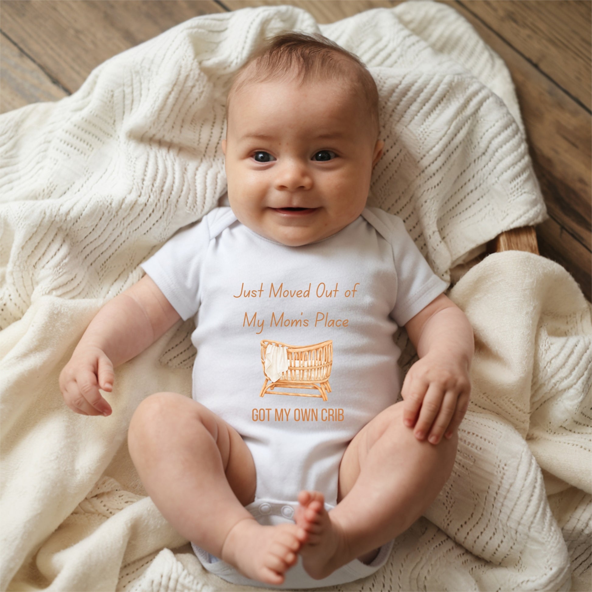 Welcome the tiniest new tenant with a onesie that tells the truth: this baby just moved out—and already has their own crib.